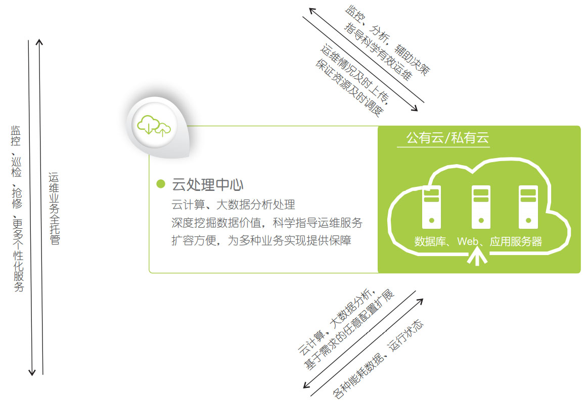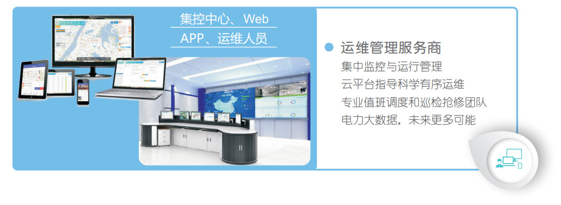 智能电力运维云平台基于云计算、移动互联网、大数据等先进技术,为电力运维服务商提供全方位业务解决方案。 借助该平台,运维服务商能全面掌握用户用电设备运行情况,使运维资源配置有的放矢;还能分析挖掘用能特征,帮用户节 能降耗;另通过大数据深入分析,释放数据潜力,精准匹配用户需求并提供个性化服务,节省资源投入、科学高效运维、创 造更大价值。